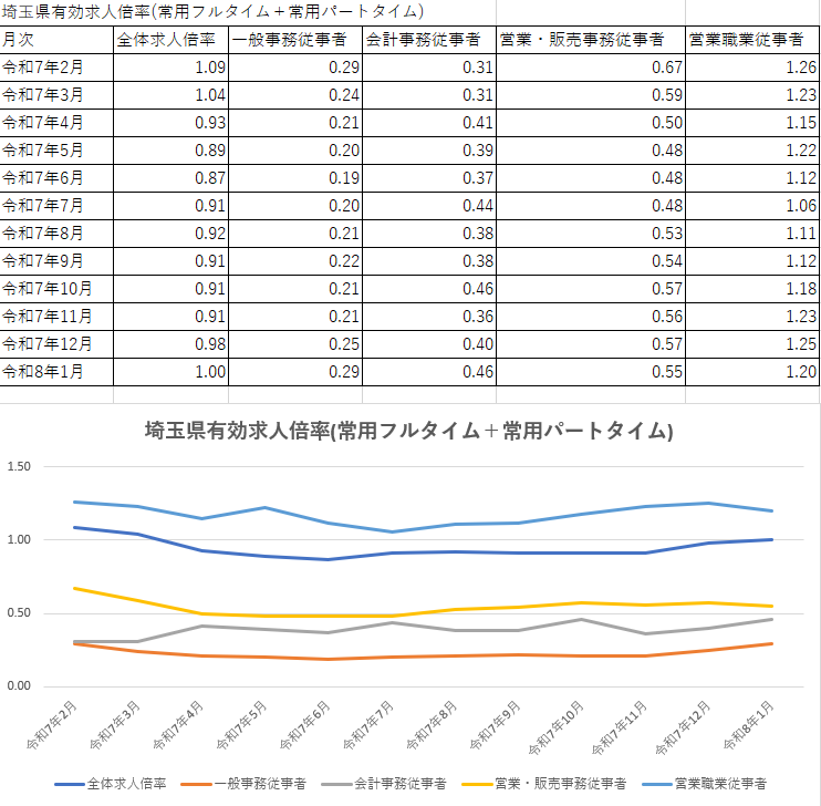 全体の求人倍率、各職種別求人倍率を確認しましょう。