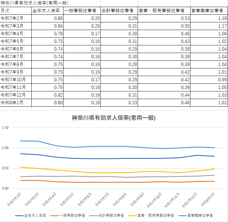 有効求人倍率は、求職者(仕事を探している人)1人あたり何件の求人があるかを示しています。1以下の数字は希望者の方が多いということです。