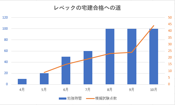 ずっと20点代前半だったのが、宅建試験がある10月に入って44点を取ったのが衝撃的で今でも覚えています。4肢択一試験は何かがかみ合うと一気に点数が伸びますので、最後まで諦めないのが大切です。